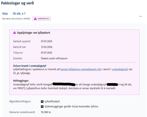 Frá og með 1. október 2025 mun hver heimild til að breyta ávísun í undanþágulyf gilda meðan á skorti viðkomandi lyfs stendur, og að auki viku til viðbótar. Ávísanir á undanþágulyf sem koma í stað lyfs í skorti - þegar ekki er hægt að samþykkja útskipti í apóteki - munu einnig verða samþykktar í viku eftir að skortur er yfirstaðinn. Þessi viðbótarvika er til að tryggja að markaðssetta lyfið hafi borist til allra landshluta áður en heimild til útskipta rennur út. Með þessu er vonast til að meiri fyrirsjáanleiki verði fyrir heildsölur sem útvega undanþágulyf, og fyrir apótek til að tryggja sér birgðir fyrir lyfjanotendur.
